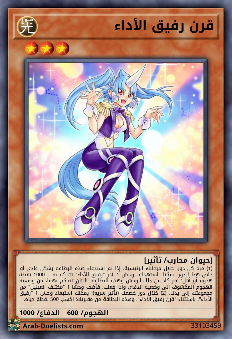 (1) مرة كل دور، خلال مرحلتك الرئيسية، إذا تم استدعاء هذه البطاقة بشكل عادي أو خاص هذا الدور: يمكنك استهداف وحش 1 آخر "رفيق الأداء" تتحكم به بـ 1000 نقطة هجوم أو أقل؛ غير كلا من ذلك الوحش وهذه البطاقة، اللتان تتحكم بهما، من وضعية الهجوم المكشوف إلى وضعية الدفاع، وإذا فعلت، فأضف وحشًا 1 "مختلف العينين" من مجموعتك إلى يدك. (2) خلال دور خصمك (تأثير سريع): يمكنك استبعاد وحش 1 "رفيق الأداء"، باستثناء "قرن رفيق الأداء"، وهذه البطاقة من مقبرتك؛ اكسب 500 نقطة حياة. |