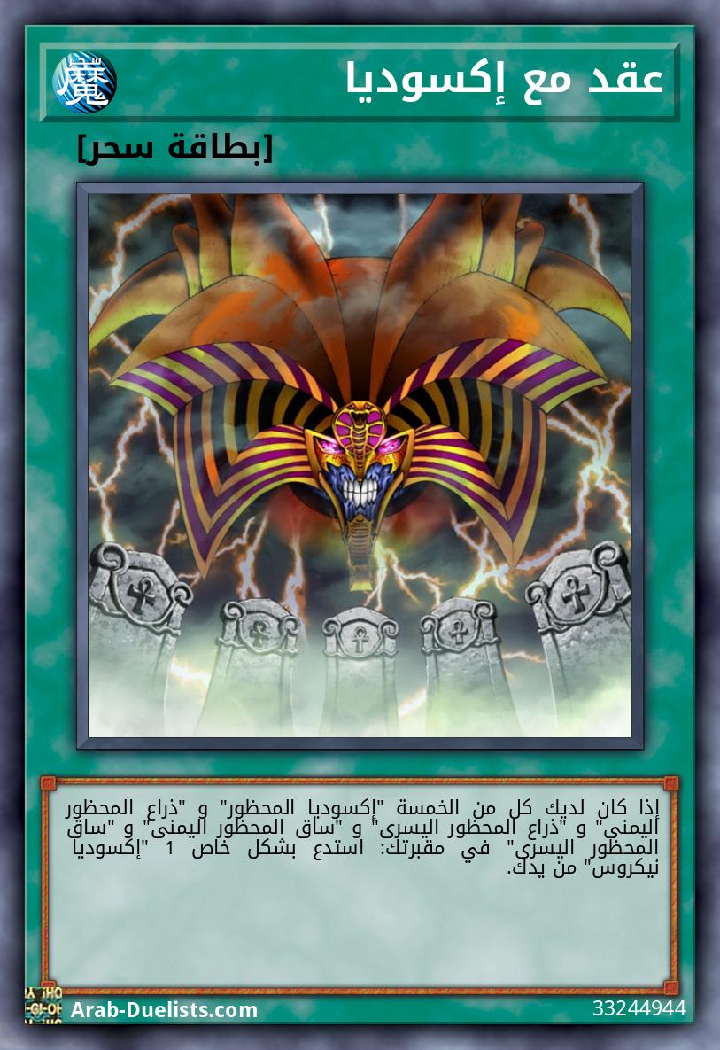 إذا كان لديك كل من الخمسة "إكسوديا المحظور" و "ذراع المحظور اليمنى" و "ذراع المحظور اليسرى" و "ساق المحظور اليمنى" و "ساق المحظور اليسرى" في مقبرتك: استدع بشكل خاص 1 "إكسوديا نيكروس" من يدك. |