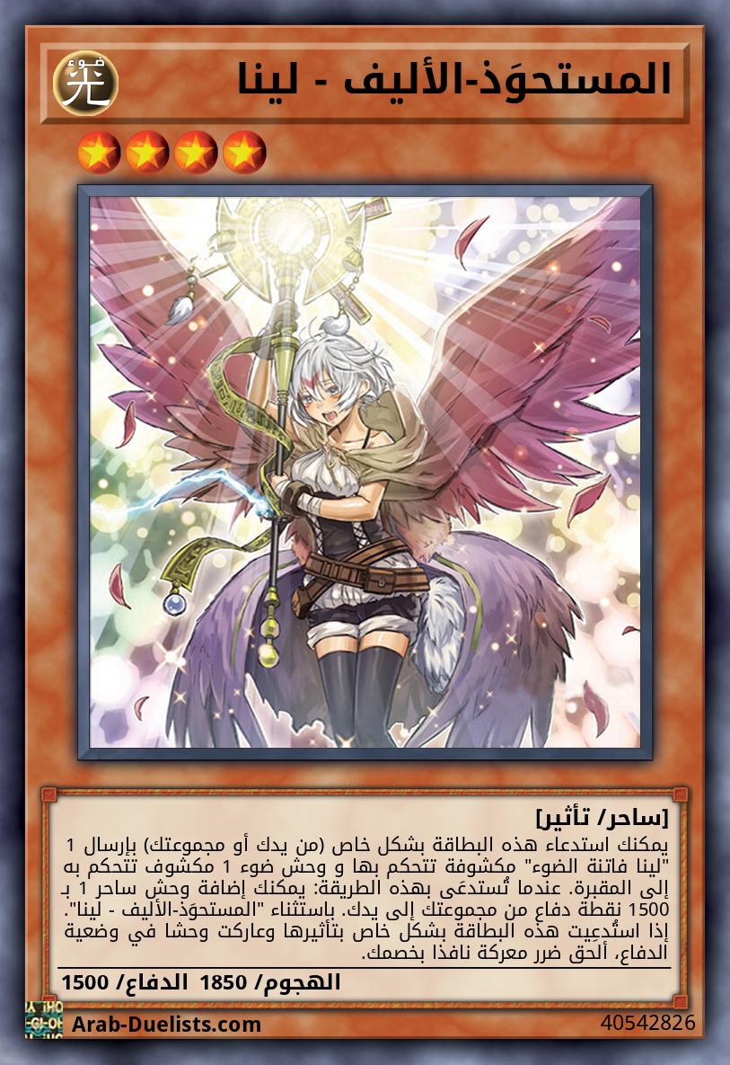 يمكنك استدعاء هذه البطاقة بشكل خاص (من يدك أو مجموعتك) بإرسال 1 "لينا فاتنة الضوء" مكشوفة تتحكم بها و وحش ضوء 1 مكشوف تتحكم به إلى المقبرة. عندما تُستدعَى بهذه الطريقة: يمكنك إضافة وحش ساحر 1 بـ 1500 نقطة دفاع من مجموعتك إلى يدك. باستثناء "المستحوَذ-الأليف - لينا". إذا استُدعِيت هذه البطاقة بشكل خاص بتأثيرها وعاركت وحشا في وضعية الدفاع، ألحق ضرر معركة نافذا بخصمك. |