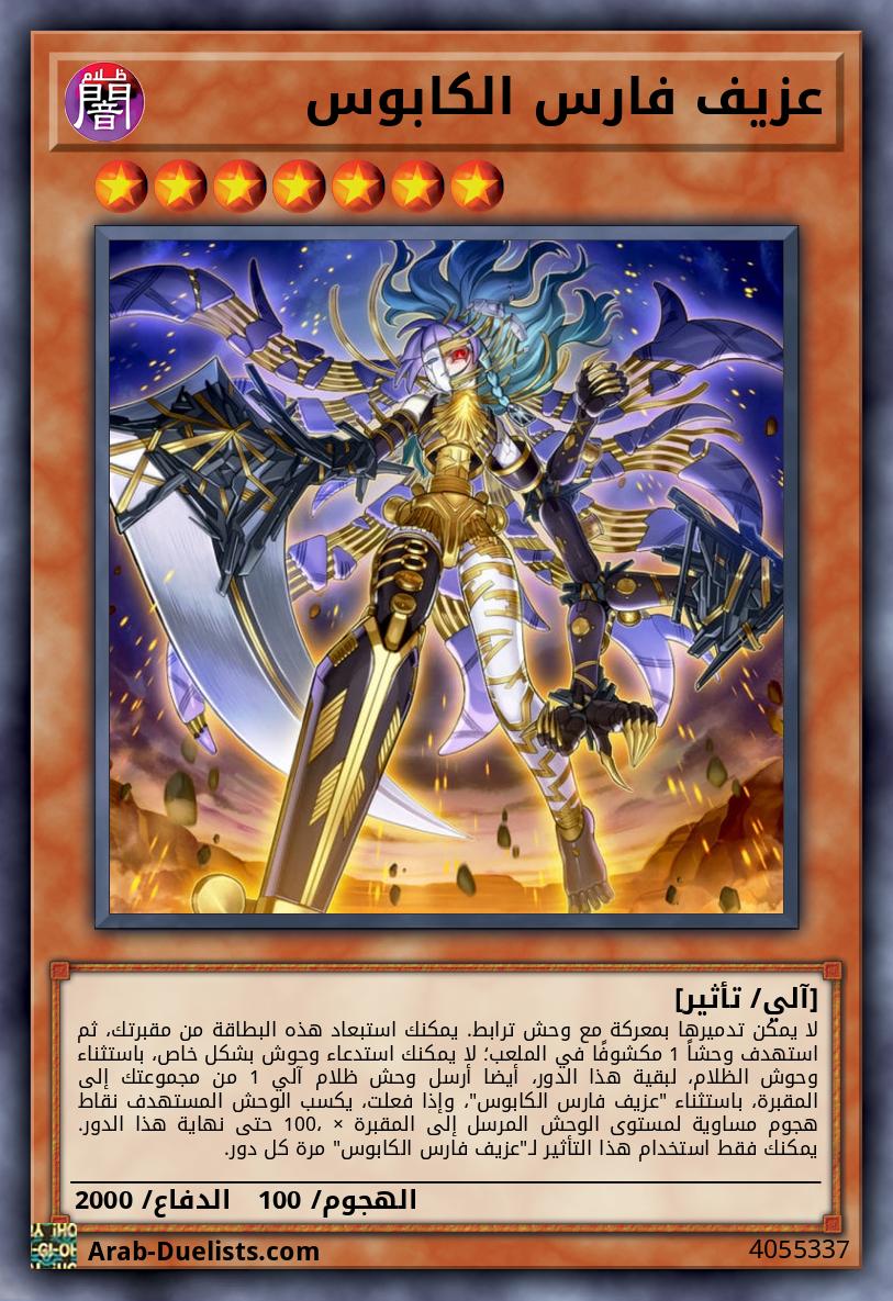 لا يمكن تدميرها بمعركة مع وحش ترابط. يمكنك استبعاد هذه البطاقة من مقبرتك، ثم استهدف وحشاً 1 مكشوفًا في الملعب؛ لا يمكنك استدعاء وحوش بشكل خاص، باستثناء وحوش الظلام، لبقية هذا الدور، أيضا أرسل وحش ظلام آلي 1 من مجموعتك إلى المقبرة، باستثناء "عزيف فارس الكابوس"، وإذا فعلت، يكسب الوحش المستهدف نقاط هجوم مساوية لمستوى الوحش المرسل إلى المقبرة × 100، حتى نهاية هذا الدور. يمكنك فقط استخدام هذا التأثير لـ "عزيف فارس الكابوس" مرة كل دور. |