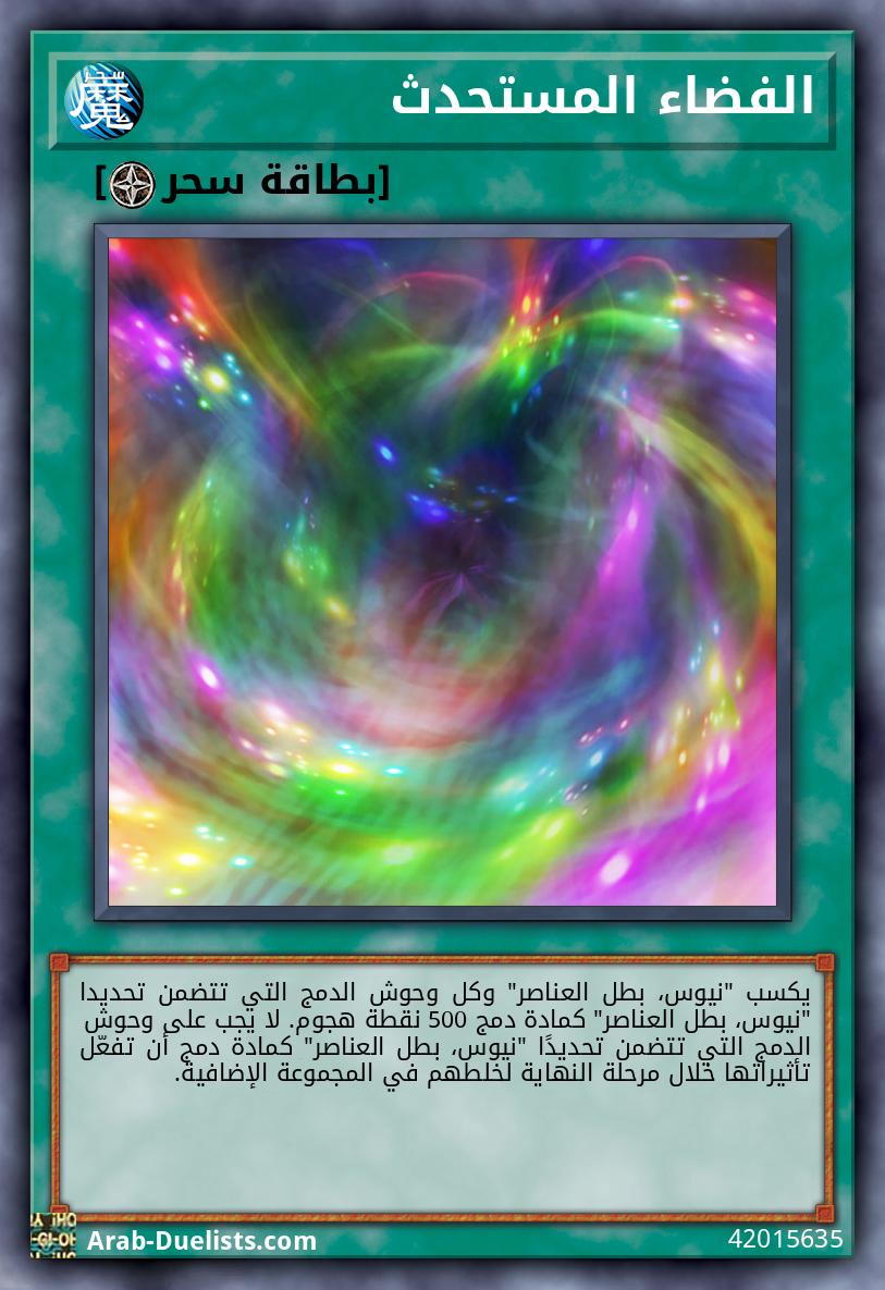 يكسب "نيوس، بطل العناصر" وكل وحوش الدمج التي تتضمن تحديدا "نيوس، بطل العناصر" كمادة دمج 500 نقطة هجوم. لا يجب على وحوش الدمج التي تتضمن تحديدًا "نيوس، بطل العناصر" كمادة دمج أن تفعّل تأثيراتها خلال مرحلة النهاية لخلطهم في المجموعة الإضافية. |