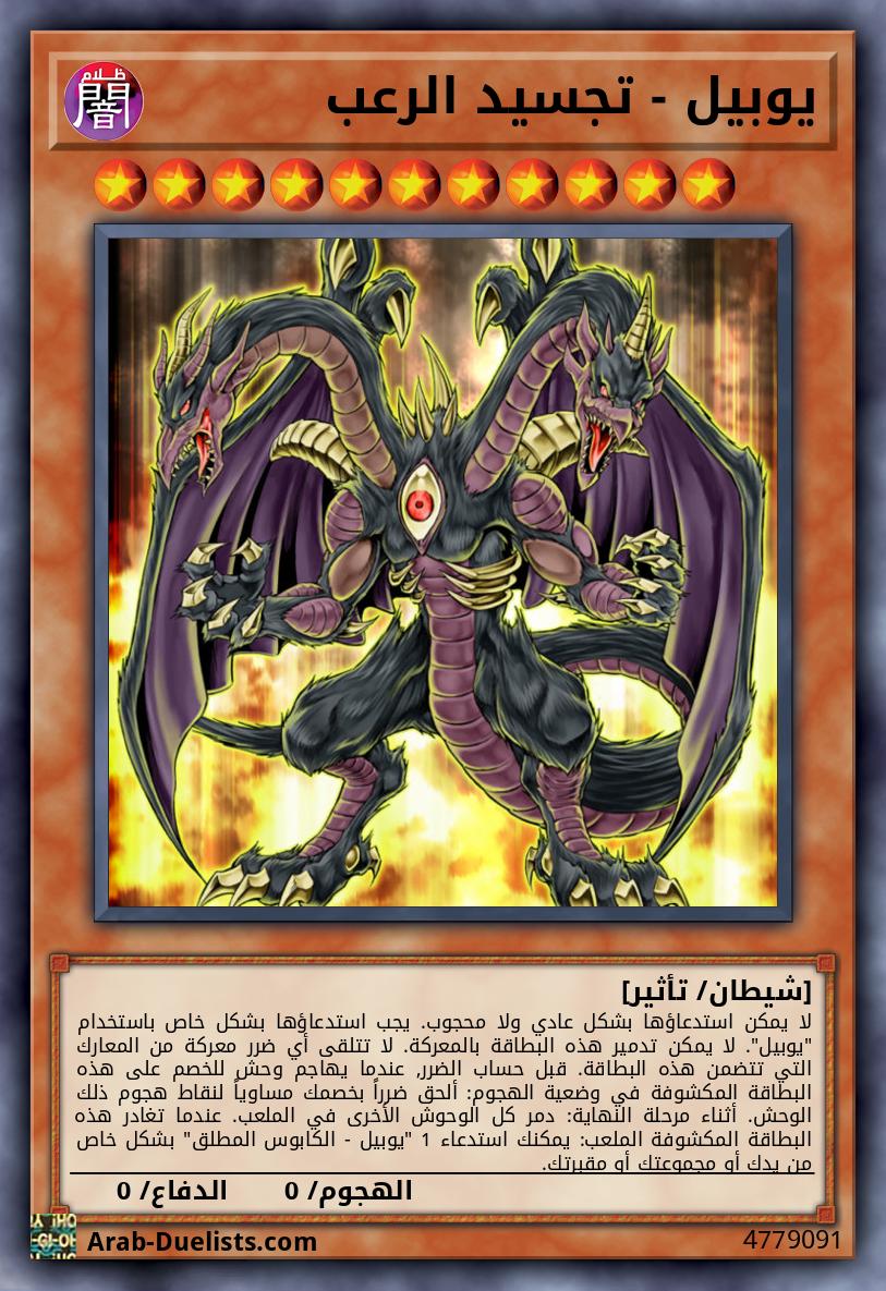 لا يمكن استدعاؤها بشكل عادي ولا محجوب. يجب استدعاؤها بشكل خاص باستخدام "يوبيل". لا يمكن تدمير هذه البطاقة بالمعركة. لا تتلقى أي ضرر معركة من المعارك التي تتضمن هذه البطاقة. قبل حساب الضرر, عندما يهاجم وحش للخصم على هذه البطاقة المكشوفة في وضعية الهجوم: ألحق ضرراً بخصمك مساوياً لنقاط هجوم ذلك الوحش. أثناء مرحلة النهاية: دمر كل الوحوش الأخرى في الملعب. عندما تغادر هذه البطاقة المكشوفة الملعب: يمكنك استدعاء 1 "يوبيل - الكابوس المطلق" بشكل خاص من يدك أو مجموعتك أو مقبرتك. |