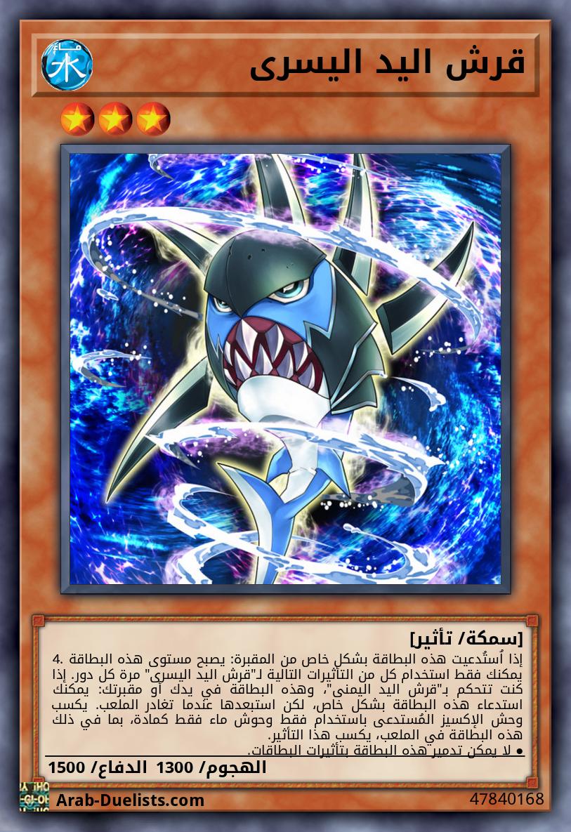 إذا اُستُدعيت هذه البطاقة بشكل خاص من المقبرة: يصبح مستوى هذه البطاقة 4. يمكنك فقط استخدام كل من التأثيرات التالية لـ "قرش اليد اليسرى" مرة كل دور. إذا كنت تتحكم بـ "قرش اليد اليمنى"، وهذه البطاقة في يدك أو مقبرتك: يمكنك استدعاء هذه البطاقة بشكل خاص، لكن استبعدها عندما تغادر الملعب. يكسب وحش الإكسيز المُستدعى باستخدام فقط وحوش ماء فقط كمادة، بما في ذلك هذه البطاقة في الملعب، يكسب هذا التأثير. |