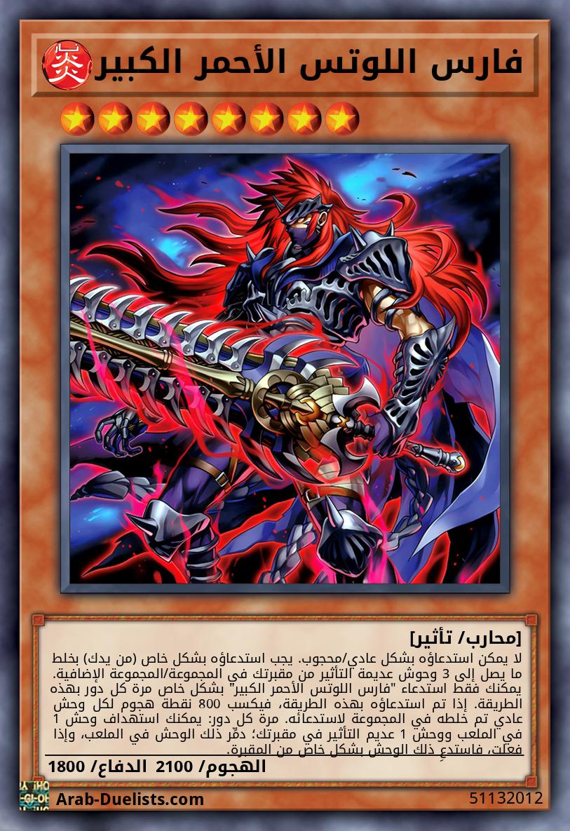 لا يمكن استدعاؤه بشكل عادي/محجوب. يجب استدعاؤه بشكل خاص (من يدك) بخلط ما يصل إلى 3 وحوش عديمة التأثير من مقبرتك في المجموعة/المجموعة الإضافية. يمكنك فقط استدعاء "فارس اللوتس الأحمر الكبير" بشكل خاص مرة كل دور بهذه الطريقة. إذا تم استدعاؤه بهذه الطريقة، فيكسب 800 نقطة هجوم لكل وحش عادي تم خلطه في المجموعة لاستدعائه. مرة كل دور: يمكنك استهداف وحش 1 في الملعب ووحش 1 عديم التأثير في مقبرتك؛ دمِّر ذلك الوحش في الملعب، وإذا فعلت، فاستدعِ ذلك الوحش بشكل خاص من المقبرة. |