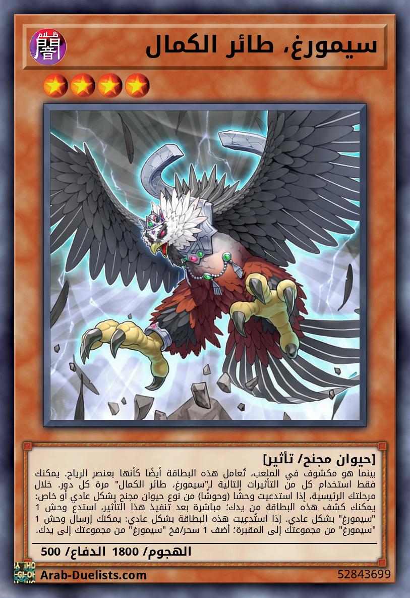 بينما هو مكشوف في الملعب، تُعامل هذه البطاقة أيضًا كأنها بعنصر الرياح. يمكنك فقط استخدام كل من التأثيرات التالية لـ "سيمورغ، طائر الكمال" مرة كل دور. خلال مرحلتك الرئيسية، إذا استدعيت وحشًا (وحوشًا) من نوع حيوان مجنح بشكل عادي أو خاص: يمكنك كشف هذه البطاقة من يدك؛ مباشرة بعد تنفيذ هذا التأثير، استدع وحش 1 "سيمورغ" بشكل عادي. إذا استُدعِيت هذه البطاقة بشكل عادي: يمكنك إرسال وحش 1 "سيمورغ" من مجموعتك إلى المقبرة؛ أضف 1 سحر/فخ "سيمورغ" من مجموعتك إلى يدك. |