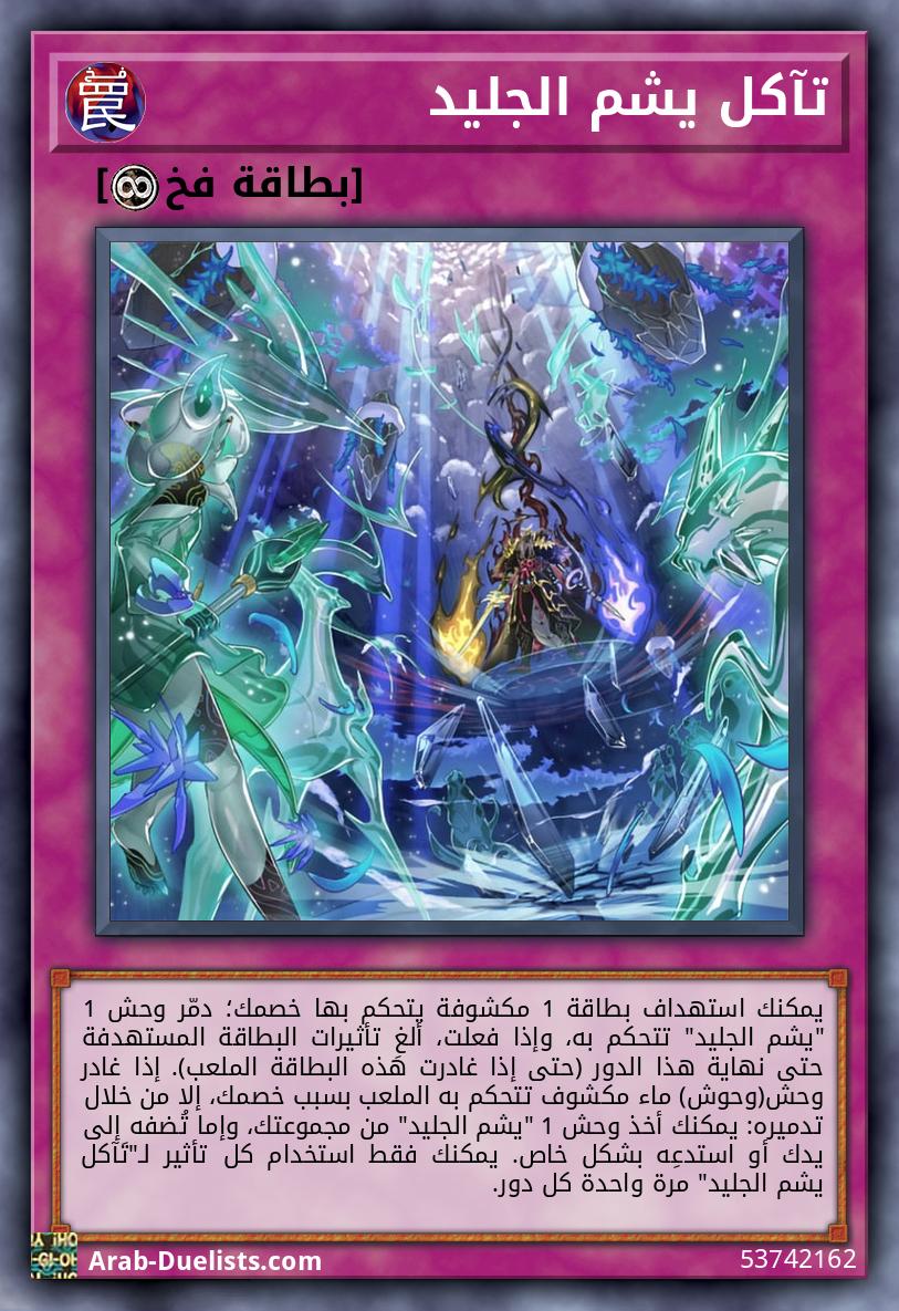 يمكنك استهداف بطاقة 1 مكشوفة يتحكم بها خصمك؛ دمّر وحش 1 "يشم الجليد" تتحكم به، وإذا فعلت، ألغِ تأثيرات البطاقة المستهدفة حتى نهاية هذا الدور (حتى إذا غادرت هذه البطاقة الملعب). إذا غادر وحش(وحوش) ماء مكشوف تتحكم به الملعب بسبب خصمك، إلا من خلال تدميره: يمكنك أخذ وحش 1 "يشم الجليد" من مجموعتك، وإما تُضفه إلى يدك أو استدعِه بشكل خاص. يمكنك فقط استخدام كل تأثير لـ "تَآكل يشم الجليد" مرة واحدة كل دور. |