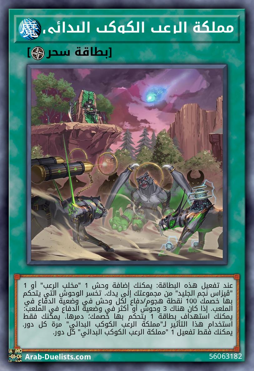 عند تفعيل هذه البطاقة: يمكنك إضافة وحش 1 "مخلب الرعب" أو 1 "ڤيزاس نجم الجليد" من مجموعتك إلى يدك. تخسر الوحوش التي يتحكم بها خصمك 100 نقطة هجوم/دفاع لكل وحش في وضعية الدفاع في الملعب. إذا كان هناك 3 وحوش أو أكثر في وضعية الدفاع في الملعب: يمكنك استهداف بطاقة 1 يتحكم بها خصمك؛ دمرها. يمكنك فقط استخدام هذا التأثير لـ "مملكة الرعب الكوكب البدائي" مرة كل دور. يمكنك فقط تفعيل 1 "مملكة الرعب الكوكب البدائي" كل دور. |