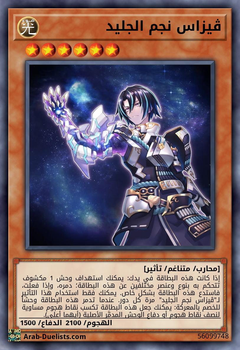 إذا كانت هذه البطاقة في يدك: يمكنك استهداف وحش 1 مكشوف تتحكم به بنوع وعنصر مختلفين عن هذه البطاقة؛ دمره، وإذا فعلت، فاستدع هذه البطاقة بشكل خاص. يمكنك فقط استخدام هذا التأثير لـ "ڤيزاس نجم الجليد" مرة كل دور. عندما تدمر هذه البطاقة وحشاً للخصم بالمعركة: يمكنك جعل هذه البطاقة تكسب نقاط هجوم مساوية لنصف نقاط هجوم أو دفاع الوحش المدمَّر الأصلية (أيهما أعلى). |