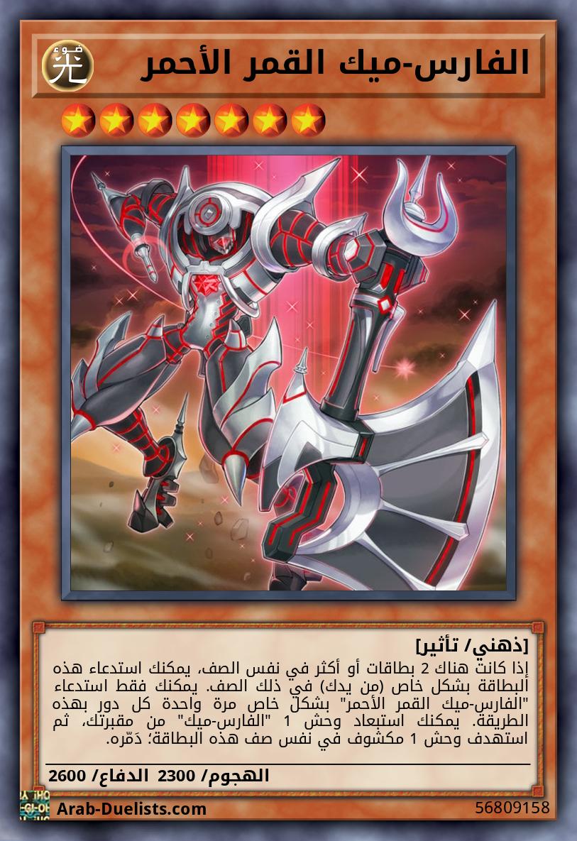 إذا كانت هناك 2 بطاقات أو أكثر في نفس الصف، يمكنك استدعاء هذه البطاقة بشكل خاص (من يدك) في ذلك الصف. يمكنك فقط استدعاء "الفارس-ميك القمر الأحمر" بشكل خاص مرة واحدة كل دور بهذه الطريقة. يمكنك استبعاد وحش 1 "الفارس-ميك" من مقبرتك، ثم استهدف وحش 1 مكشوف في نفس صف هذه البطاقة؛ دَمّره. |