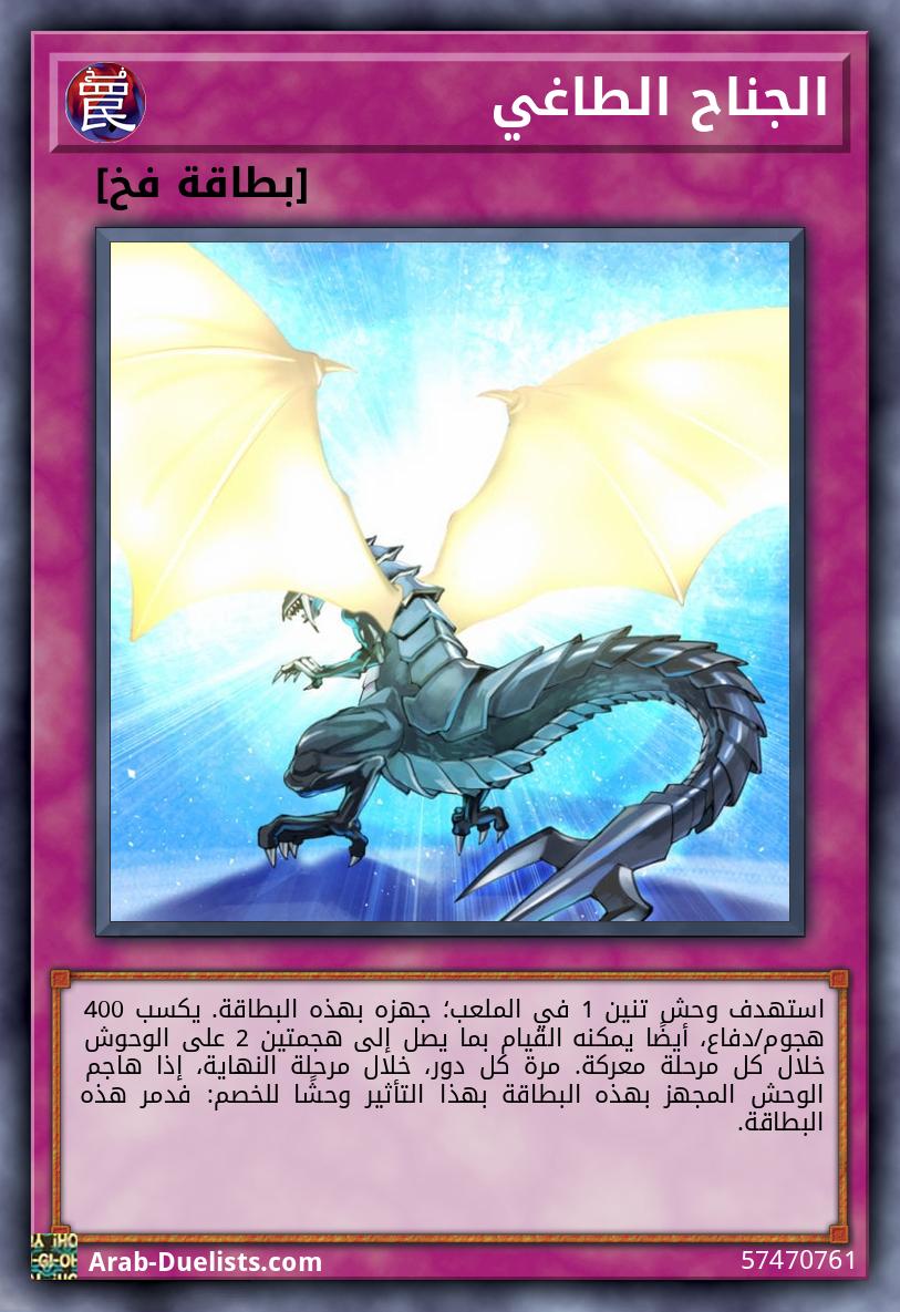 استهدف وحش تنين 1 في الملعب؛ جهزه بهذه البطاقة. يكسب 400 هجوم/دفاع، أيضًا يمكنه القيام بما يصل إلى هجمتين 2 على الوحوش خلال كل مرحلة معركة. مرة كل دور، خلال مرحلة النهاية، إذا هاجم الوحش المجهز بهذه البطاقة بهذا التأثير وحشًا للخصم: فدمر هذه البطاقة. |