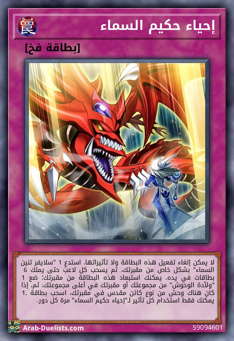 لا يمكن إلغاء تفعيل هذه البطاقة ولا تأثيراتها. استدعِ 1 "سلايفر تنين السماء" بشكل خاص من مقبرتك، ثم يسحب كل لاعب حتى يملك 6 بطاقات في يده. يمكنك استبعاد هذه البطاقة من مقبرتك؛ ضع 1 "ولاّدة الوحوش" من مجموعتك أو مقبرتك في أعلى مجموعتك، ثم، إذا كان هناك وحش من نوع كائن مقدس في مقبرتك، اسحب بطاقة 1. يمكنك فقط استخدام كل تأثير لـ "إحياء حكيم السماء" مرة كل دور. |