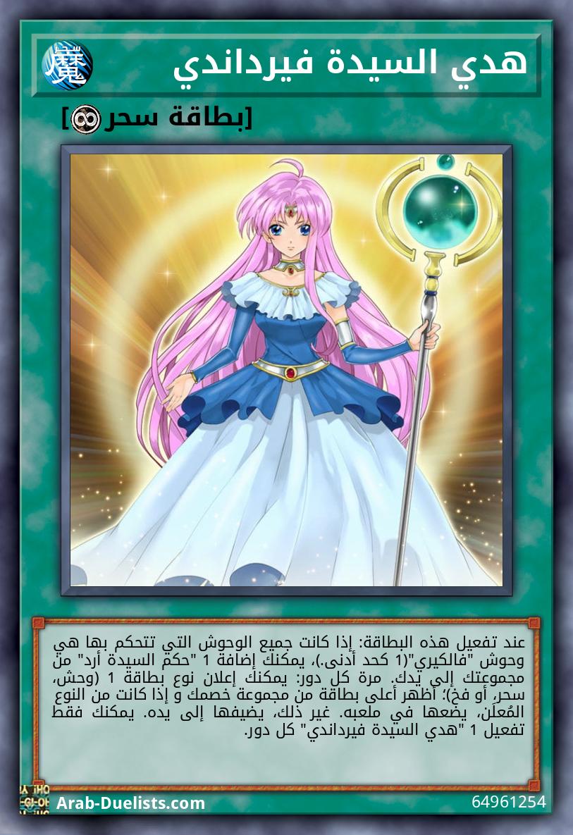 عند تفعيل هذه البطاقة: إذا كانت جميع الوحوش التي تتحكم بها هي وحوش "فالكيري"(1 كحد أدنى.)، يمكنك إضافة 1 "حكم السيدة أرد" من مجموعتك إلى يدك. مرة كل دور: يمكنك إعلان نوع بطاقة 1 (وحش، سحر، أو فخ)؛ أظهر أعلى بطاقة من مجموعة خصمك و إذا كانت من النوع المُعلَن، يضعها في ملعبه. غير ذلك، يضيفها إلى يده. يمكنك فقط تفعيل 1 "هدي السيدة فيرداندي" كل دور. |