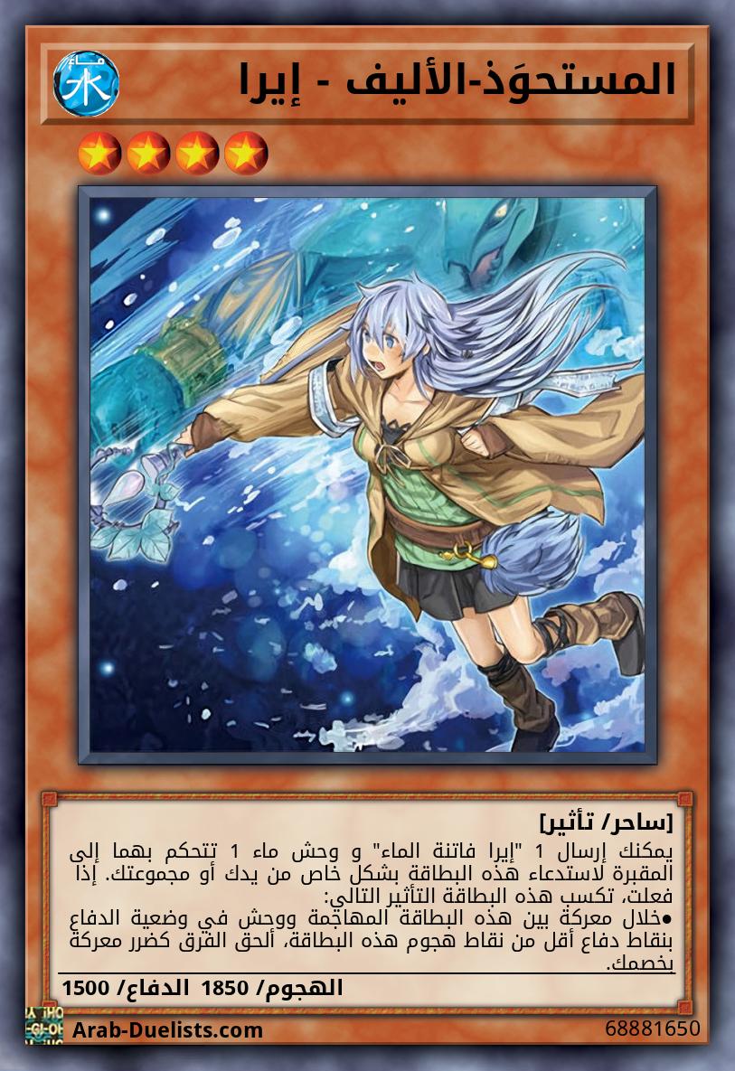 يمكنك إرسال 1 "إيرا فاتنة الماء" و وحش ماء 1 تتحكم بهما إلى المقبرة لاستدعاء هذه البطاقة بشكل خاص من يدك أو مجموعتك. إذا فعلت، تكسب هذه البطاقة التأثير التالي: |