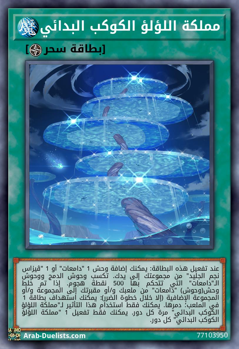 عند تفعيل هذه البطاقة: يمكنك إضافة وحش 1 "دامعات" أو 1 "ڤيزاس نجم الجليد" من مجموعتك إلى يدك. تكسب وحوش الدمج ووحوش الـ "دامعات" التي تتحكم بها 500 نقطة هجوم. إذا تم خلط وحش(وحوش) "دامعات" من ملعبك و/أو مقبرتك إلى المجموعة و/أو المجموعة الإضافية (إلا خلال خطوة الضرر): يمكنك استهداف بطاقة 1 في الملعب؛ دمرها. يمكنك فقط استخدام هذا التأثير لـ "مملكة اللؤلؤ الكوكب البدائي" مرة كل دور. يمكنك فقط تفعيل 1 "مملكة اللؤلؤ الكوكب البدائي" كل دور. |