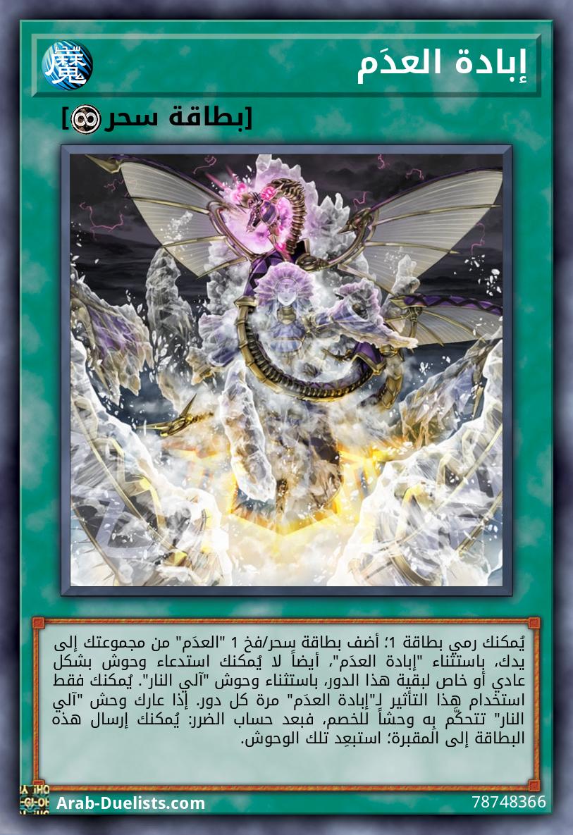 يُمكنك رمي بطاقة 1؛ أضف بطاقة سحر/فخ 1 "العدَم" من مجموعتك إلى يدك، باستثناء "إبادة العدَم"، أيضاً لا يُمكنك استدعاء وحوش بشكل عادي أو خاص لبقية هذا الدور، باستثناء وحوش "آلي النار". يُمكنك فقط استخدام هذا التأثير لـ "إبادة العدَم" مرة كل دور. إذا عارك وحش "آلي النار" تتحكَّم بِه وحشاً للخصم، فبعد حساب الضرر: يُمكنك إرسال هذه البطاقة إلى المقبرة؛ استبعِد تلك الوحوش. |