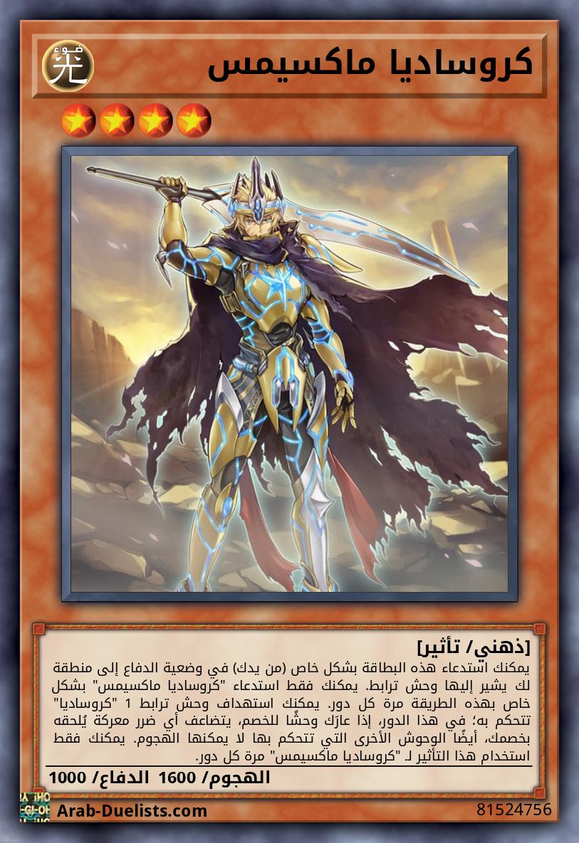 يمكنك استدعاء هذه البطاقة بشكل خاص (من يدك) في وضعية الدفاع إلى منطقة لك يشير إليها وحش ترابط. يمكنك فقط استدعاء "كروساديا ماكسيمس" بشكل خاص بهذه الطريقة مرة كل دور. يمكنك استهداف وحش ترابط 1 "كروساديا" تتحكم به؛ في هذا الدور، إذا عارَك وحشًا للخصم، يتضاعف أي ضرر معركة يُلحقه بخصمك، أيضًا الوحوش الأخرى التي تتحكم بها لا يمكنها الهجوم. يمكنك فقط استخدام هذا التأثير لـ "كروساديا ماكسيمس" مرة كل دور. |