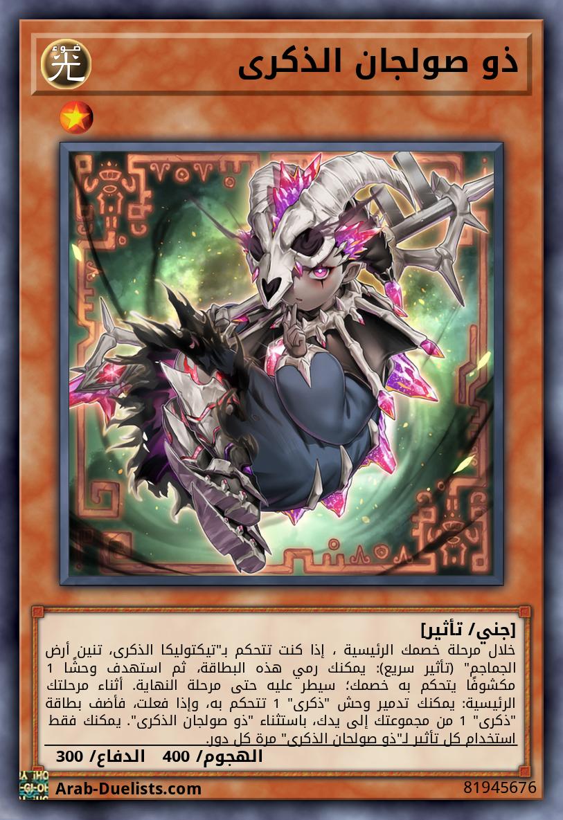 خلال مرحلة خصمك الرئيسية ، إذا كنت تتحكم بـ "تيكتوليكا الذكرى، تنين أرض الجماجم" (تأثير سريع): يمكنك رمي هذه البطاقة، ثم استهدف وحشًا 1 مكشوفًا يتحكم به خصمك؛ سيطر عليه حتى مرحلة النهاية. أثناء مرحلتك الرئيسية: يمكنك تدمير وحش "ذكرى" 1 تتحكم به، وإذا فعلت، فأضف بطاقة "ذكرى" 1 من مجموعتك إلى يدك، باستثناء "ذو صولجان الذكرى". يمكنك فقط استخدام كل تأثير لـ "ذو صولجان الذكرى" مرة كل دور. |