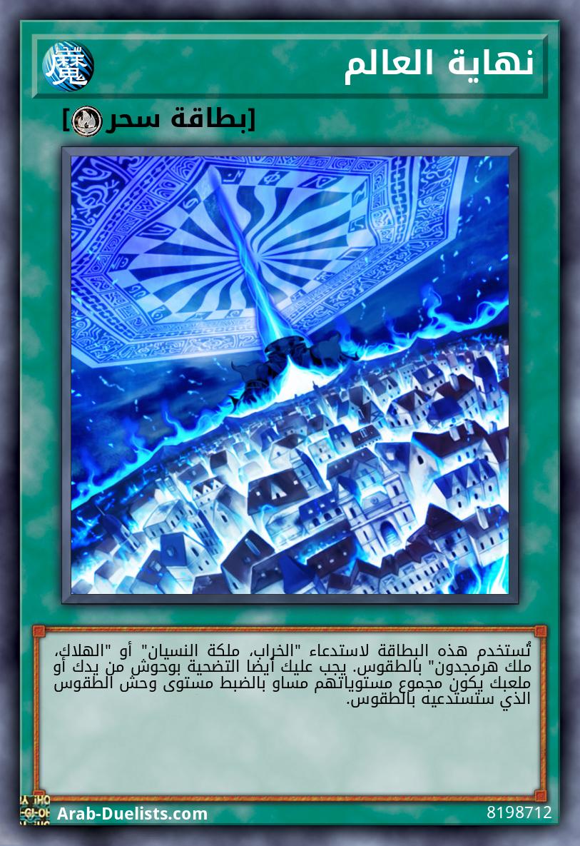 تُستخدم هذه البطاقة لاستدعاء "الخراب، ملكة النسيان" أو "الهلاك، ملك هرمجدون" بالطقوس. يجب عليك أيضا التضحية بوحوش من يدك أو ملعبك يكون مجموع مستوياتهم مساو بالضبط مستوى وحش الطقوس الذي ستستدعيه بالطقوس. |