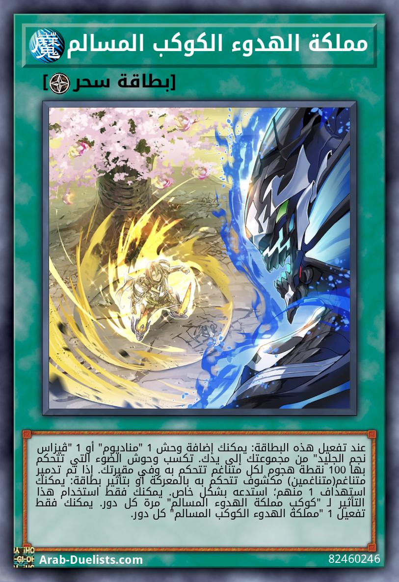 عند تفعيل هذه البطاقة: يمكنك إضافة وحش 1 "مناديوم" أو 1 "ڤيزاس نجم الجليد" من مجموعتك إلى يدك. تكسب وحوش الضوء التي تتحكم بها 100 نقطة هجوم لكل متناغم تتحكم به وفي مقبرتك. إذا تم تدمير متناغم(متناغمين) مكشوف تتحكم به بالمعركة أو بتأثير بطاقة: يمكنك استهداف 1 منهم؛ استدعه بشكل خاص. يمكنك فقط استخدام هذا التأثير لـ "كوكب مملكة الهدوء المسالم" مرة كل دور. يمكنك فقط تفعيل 1 "مملكة الهدوء الكوكب المسالم" كل دور. |