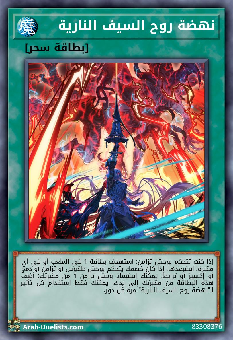 إذا كنت تتحكم بوحش تزامن: استهدف بطاقة 1 في الملعب أو في أي مقبرة؛ استبعدها. إذا كان خصمك يتحكم بوحش طقوس أو تزامن أو دمج أو إكسيز أو ترابط: يمكنك استبعاد وحش تزامن 1 من مقبرتك؛ أضف هذه البطاقة من مقبرتك إلى يدك. يمكنك فقط استخدام كل تأثير لـ "نهضة روح السيف النارية" مرة كل دور. |