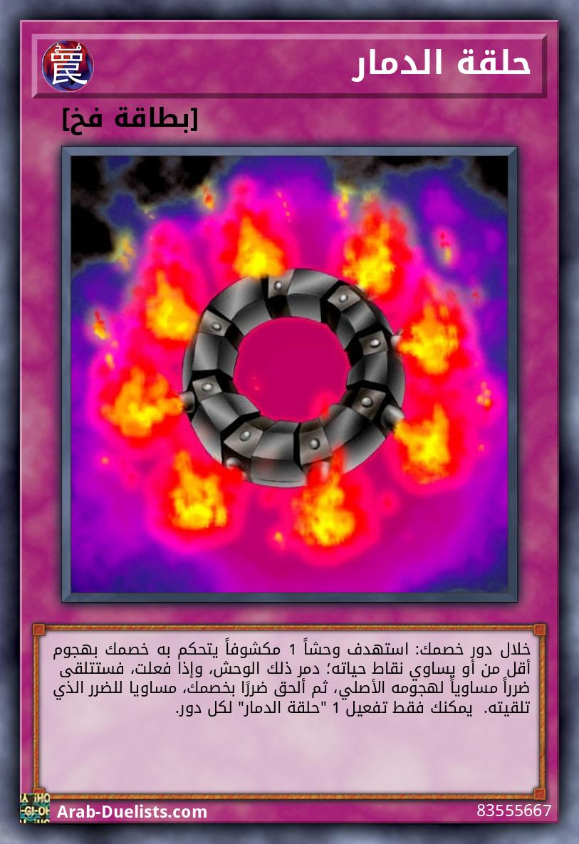 خلال دور خصمك: استهدف وحشاً 1 مكشوفاً يتحكم به خصمك بهجوم أقل من أو يساوي نقاط حياته؛ دمر ذلك الوحش، وإذا فعلت، فستتلقى ضرراً مساوياً لهجومه الأصلي، ثم ألحق ضررًا بخصمك، مساويا للضرر الذي تلقيته. يمكنك فقط تفعيل 1 "حلقة الدمار" لكل دور. |