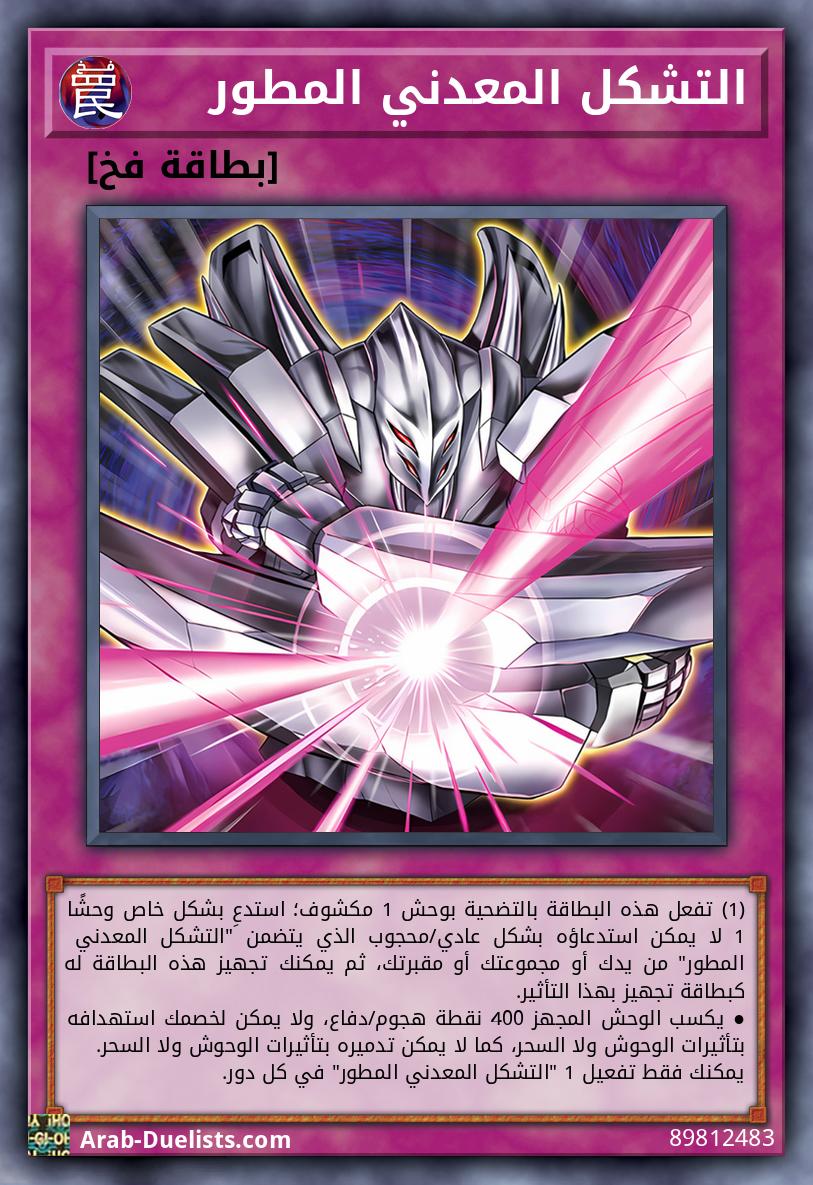 (1) تفعل هذه البطاقة بالتضحية بوحش 1 مكشوف؛ استدعِ بشكل خاص وحشًا 1 لا يمكن استدعاؤه بشكل عادي/محجوب الذي يتضمن "التشكل المعدني المطور" من يدك أو مجموعتك أو مقبرتك، ثم يمكنك تجهيز هذه البطاقة له كبطاقة تجهيز بهذا التأثير. |
