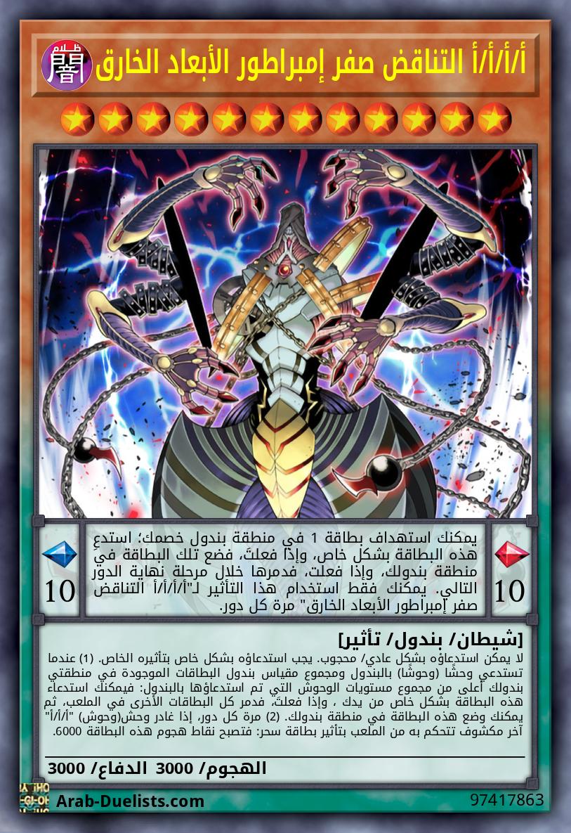 لا يمكن استدعاؤه بشكل عادي/ محجوب. يجب استدعاؤه بشكل خاص بتأثيره الخاص. (1) عندما تستدعي وحشًا (وحوشًا) بالبندول ومجموع مقياس بندول البطاقات الموجودة في منطقتي بندولك أعلى من مجموع مستويات الوحوش التي تم استدعاؤها بالبندول: فيمكنك استدعاء هذه البطاقة بشكل خاص من يدك ، وإذا فعلتَ، فدمر كل البطاقات الأخرى في الملعب، ثم يمكنك وضع هذه البطاقة في منطقة بندولك. (2) مرة كل دور، إذا غادر وحش(وحوش) "أ/أ/أ" آخر مكشوف تتحكم به من الملعب بتأثير بطاقة سحر: فتصبح نقاط هجوم هذه البطاقة 6000. وصف البندول:يمكنك استهداف بطاقة 1 في منطقة بندول خصمك؛ استدعِ هذه البطاقة بشكل خاص، وإذا فعلتَ، فضع تلك البطاقة في منطقة بندولك، وإذا فعلت، فدمرها خلال مرحلة نهاية الدور التالي. يمكنك فقط استخدام هذا التأثير لـ "أ/أ/أ/أ التناقض صفر إمبراطور الأبعاد الخارق" مرة كل دور. مقياس البندول: 10 |