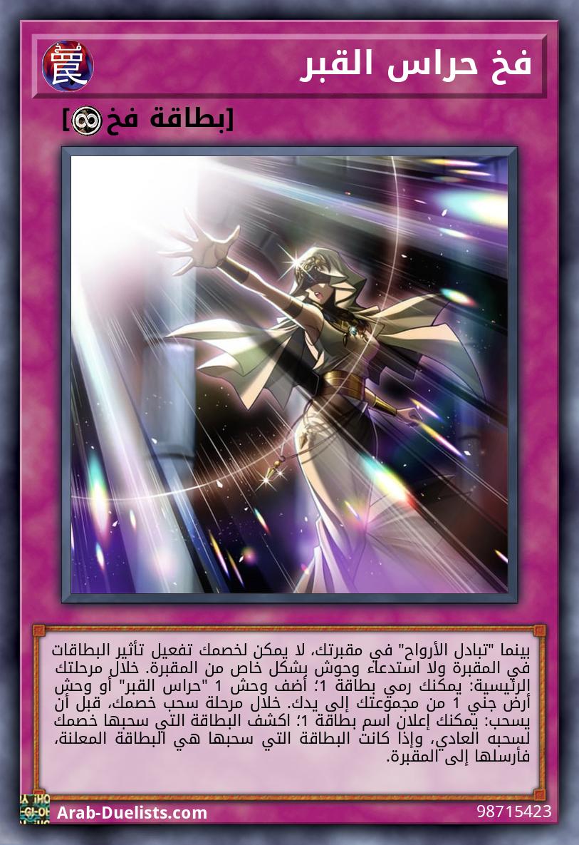 بينما "تبادل الأرواح" في مقبرتك، لا يمكن لخصمك تفعيل تأثير البطاقات في المقبرة ولا استدعاء وحوش بشكل خاص من المقبرة. خلال مرحلتك الرئيسية: يمكنك رمي بطاقة 1؛ أضف وحش 1 "حراس القبر" أو وحش أرض جني 1 من مجموعتك إلى يدك. خلال مرحلة سحب خصمك، قبل أن يسحب: يمكنك إعلان اسم بطاقة 1؛ اكشف البطاقة التي سحبها خصمك لسحبه العادي، وإذا كانت البطاقة التي سحبها هي البطاقة المعلنة، فأرسلها إلى المقبرة. |